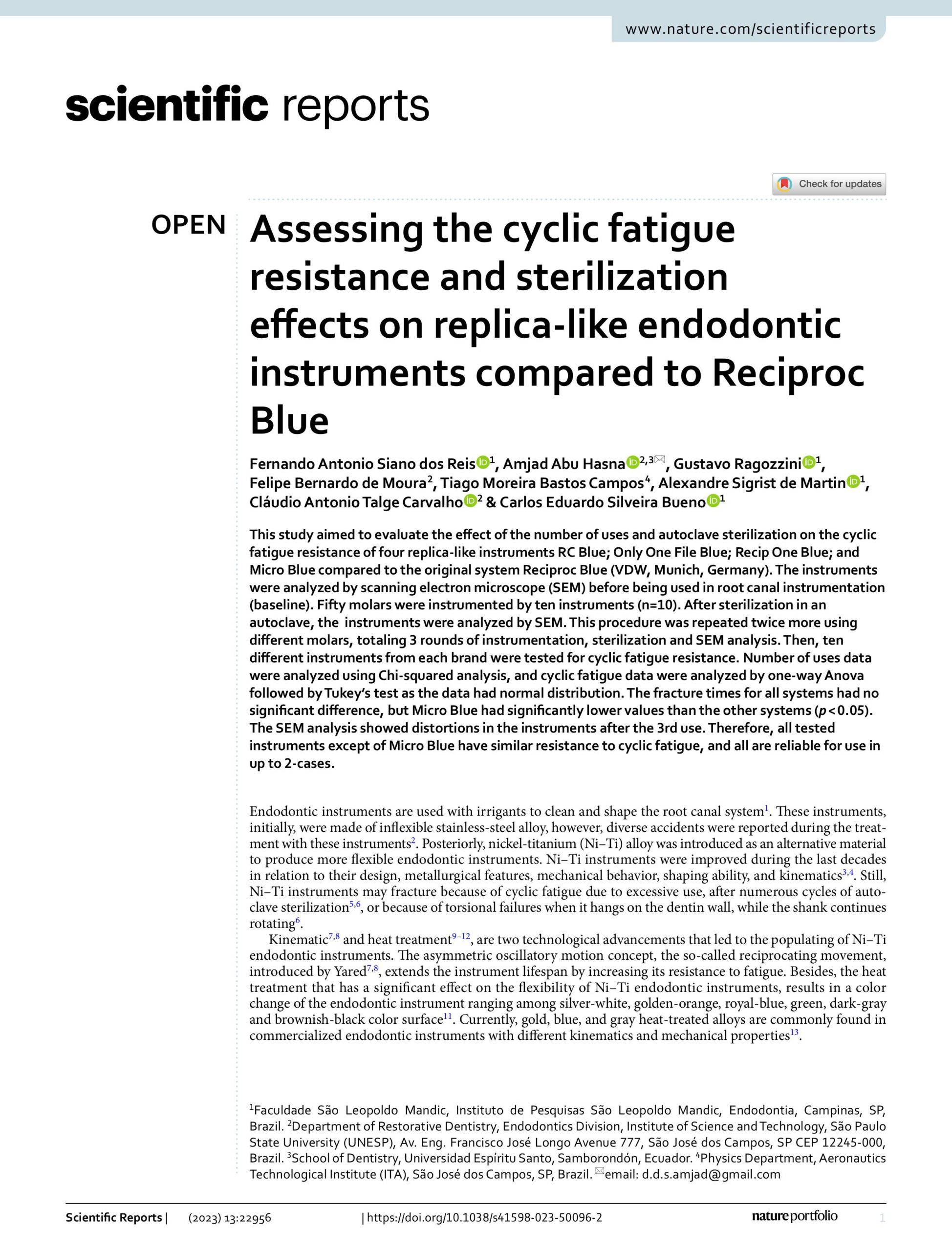 Full Study: dos Reis, F.A.S., Abu Hasna, A., Ragozzini, G. et al. Assessing the cyclic fatigue resistance and sterilization effects on replica-like endodontic instruments compared to Reciproc Blue.