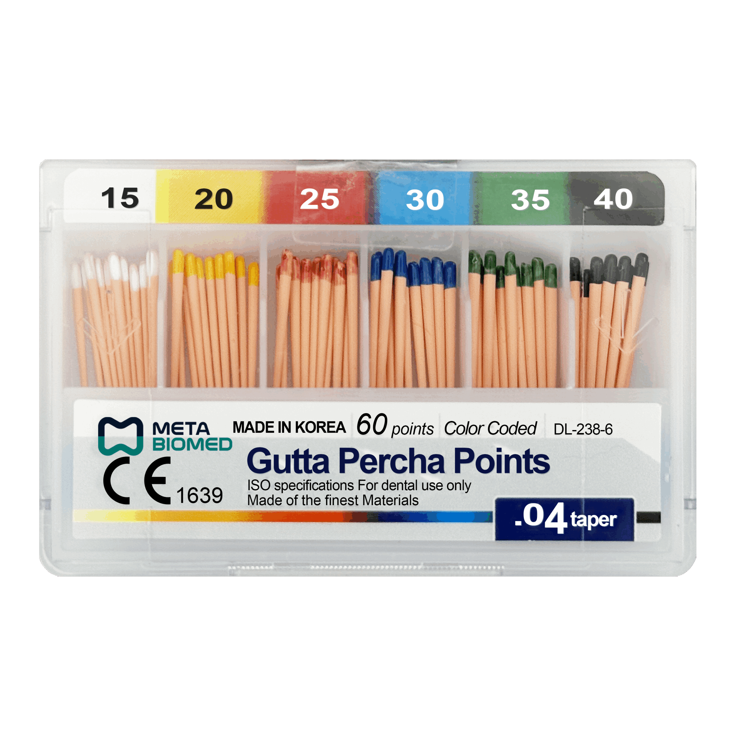 Permanent filling material for root canals treatment with uniform sizing, radiopacity, and precise fit for warm or cold obturation.